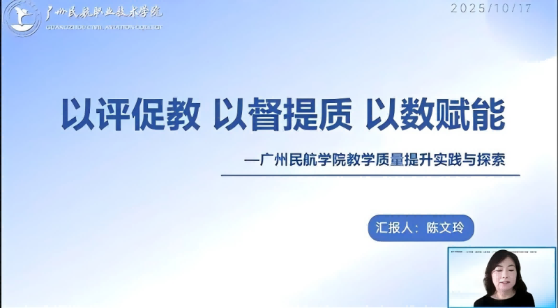 本次讲座特邀广州民航职业技术学院教务处督导室主任陈文玲担任主讲,围绕教学质量评价体系构建与教学督导机制创新,系统阐述了该校在教学质量提升方面的实践探索与成果经验。讲座紧扣“以评促教、以督提质、以数赋能”主题,结合广州民航职业技术学院的典型案例,从三个方面展开深入讲解:一是以科学评价推动教学改革,二是以督导机制创新提升教学质量,三是以数字化手段赋能教学管理。内容详实、重点突出,具有较强的指导性与实操性,为我校进一步优化教学督导与评价工作提供了有益参考。