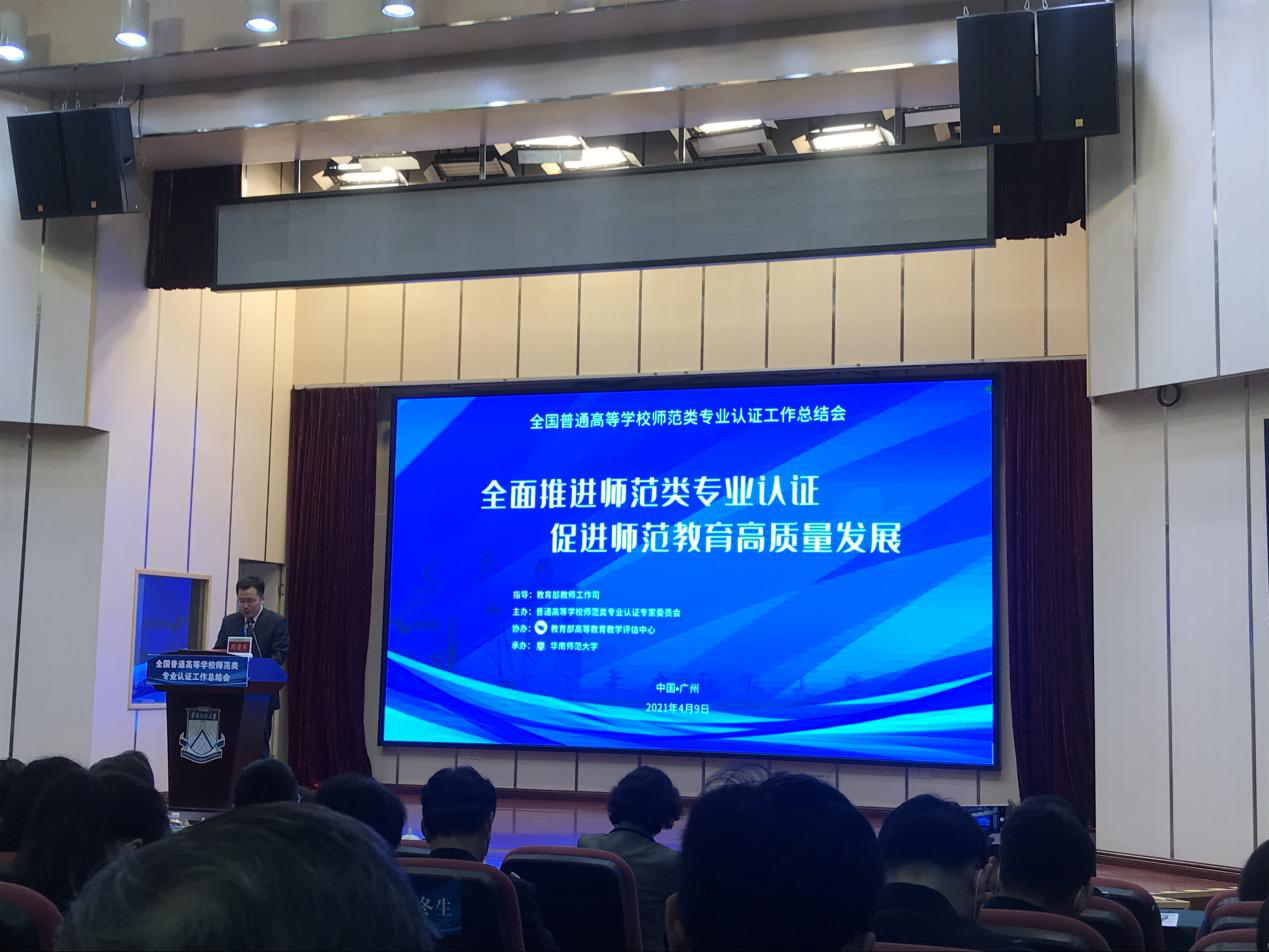 4月9日至10日,全国普通高等学校师范类专业认证工作总结会在华南师范大学举行。本次会议以“全面推进师范类专业认证,促进师范教育高质量发展”为主题,来自全国各省级教育行政部门、师范院校、教育评估机构、中小学的代表200余人现场参会。我校派出李巍副教授参加线下会议,会议同步开设近200个视频分会场,5000余人在线收看会议直播。会议分别由教育部高等教育教学评估中心副主任周爱军、北师大中国政策研究院执行院长张志勇、华南师范大学副校长陈文海主持。