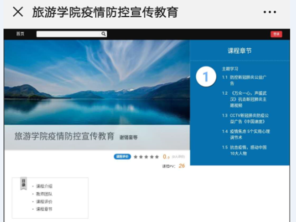 旅游学院通过“学习通”APP平台开展“线上”网络思政教育工作。已开展的“旅游学院疫情防控宣传教育”课涵盖防控新冠肺炎公益宣传、《万众一心声援武汉》《中国速度》《疫情焦虑五个实用心理调节术》和《抗击疫情感动中国10大人物》等五方面内容,要求同学们自学结束后在课程讨论平台上发表心得体会。截止目前,旅游学院1599名同学已经完成学习任务,学习访问量5800多人次。