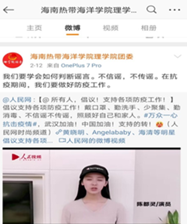 理学院通过微博推送相关疫情的知识、结合教师讲解等形式开展思政教育,让同学们了解疫情防控相关工作,坚定信心。