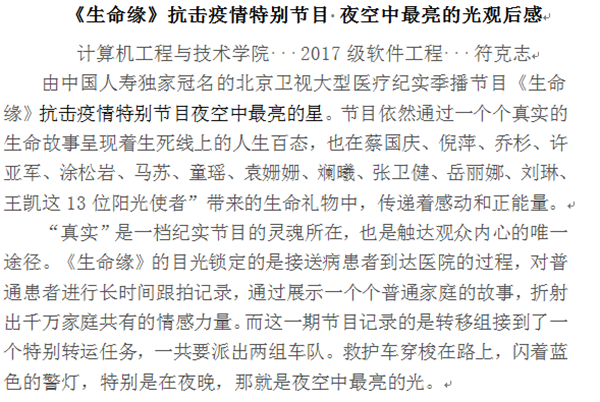 计算机科学与技术学院以“抗击疫情、珍爱生命”为主题组织学生观看抗疫一线感人事迹、学习疫情防控知识、撰写抗击疫情主题所思所想。